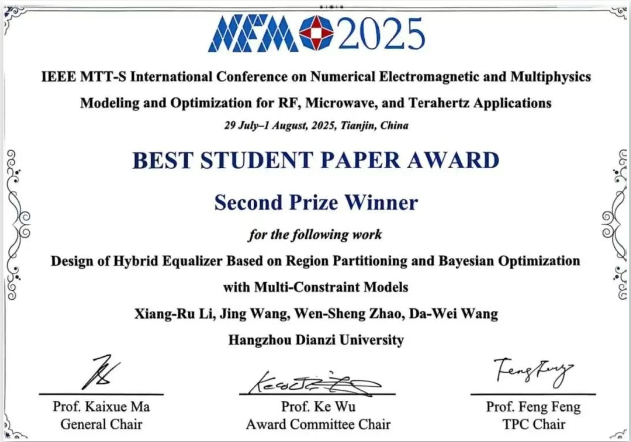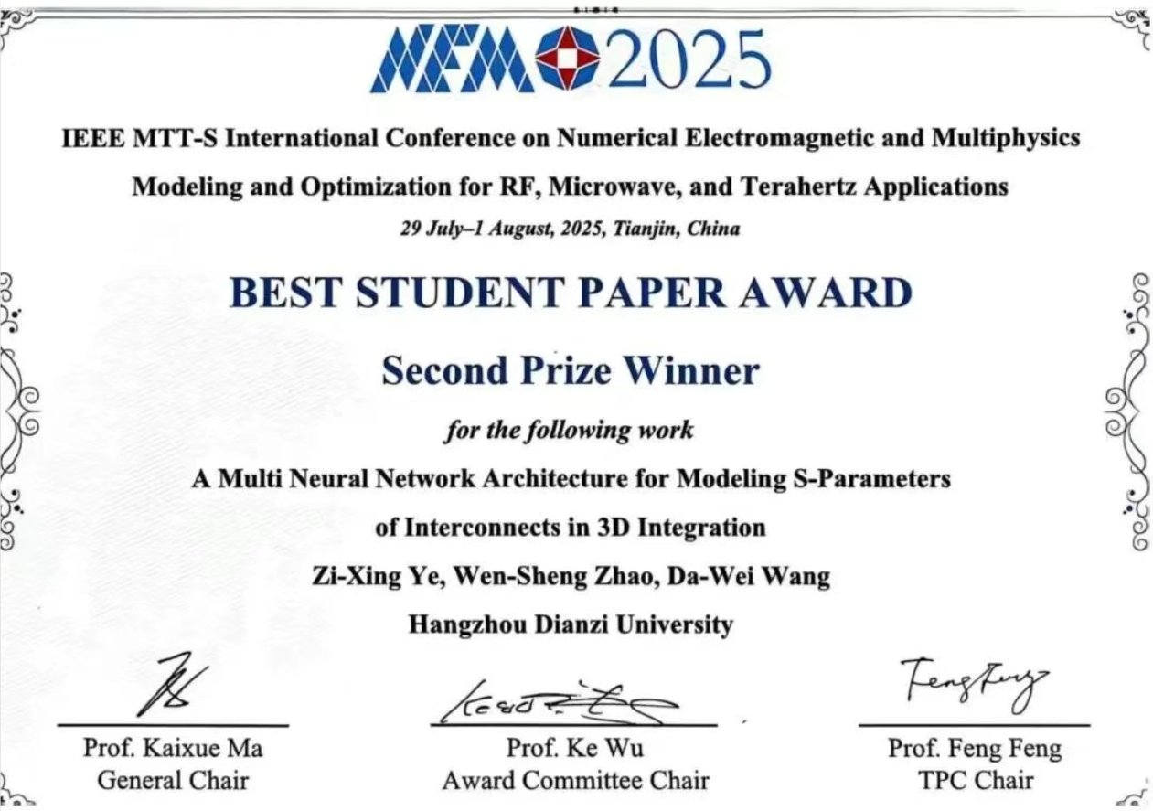 我校电子信息学院研究生叶子兴、李相儒分别作为第一作者的两篇论文入选了IEEE NEMO 2025会议学生论文竞赛,并在激烈的评选中脱颖而出,最终荣获Best Student Paper Award(Second Prize),充分展示了我校师生在三维集成微系统信号完整性领域的科研实力与创新能力。